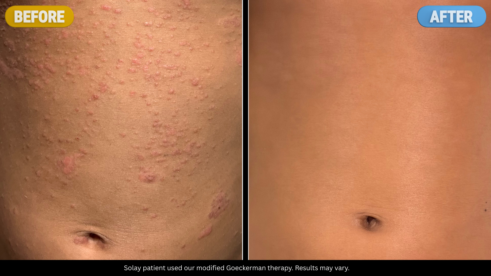 An 8-year-old girl had lived with severe psoriasis for four years. She was first treated with prescription steroid creams and UVB light therapy, which helped briefly but didn’t last. Her plaque psoriasis returned, and she developed guttate psoriasis as well. Although a biologic was recommended, her mother pursued Solay’s at-home Goeckerman therapy instead. Following treatment, both her plaque and guttate lesions resolved completely, resulting in sustained full remission and clear skin.